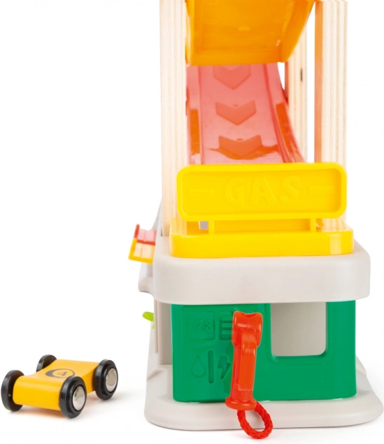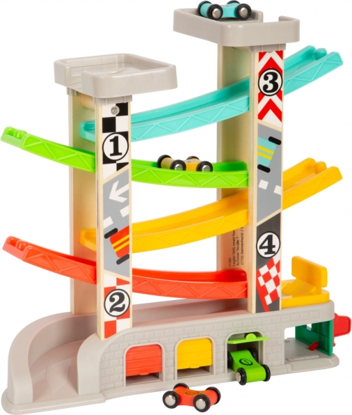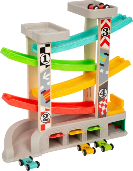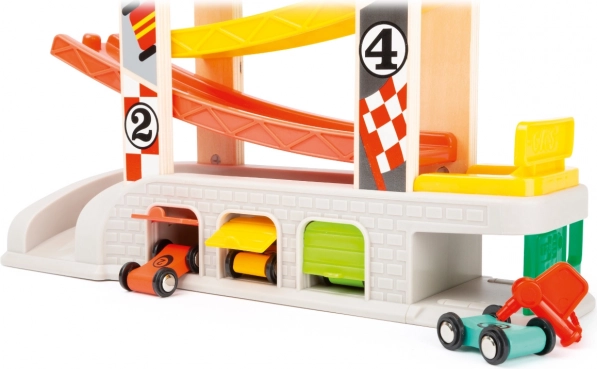 A pálya célja az utánzójáték képességeinek és a finommotorikus készségek fejlesztése, miközben a gyerekek négy különböző színű kisautóval versenyeznek. Ráadásul a praktikus parkolási és tárolási rendszernek köszönhetően a kis versenyzők a verseny után egyszerűen elpakolhatják a kisautóikat.