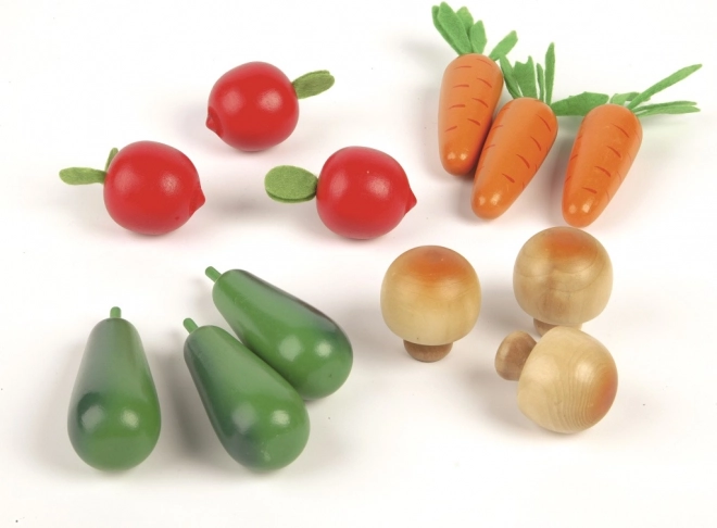 A készlet válogatott, kedvelt zöldségeket tartalmaz – sárgarépa, cukkini, paradicsom és gomba – tartós fa rekeszben. Minden darab gondosan, minőségi és felelősen beszerzett anyagokból készült, biztonságos a gyerekek számára.