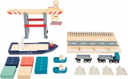 Ez az átgondolt kikötői építőkészlet valósághű logisztikai játékot kínál: a hajó két vontatóval kész a kifutásra, miközben a daru a beépített mágneseknek köszönhetően átrakja a színes konténereket. A masszív fa elemek és a finoman működő funkciók támogatják a finommotorikát, a fantáziát és a türelmet.