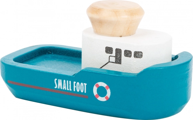 A kék hajó színes konténerekkel és két, zsinórral összekapcsolt vontatóhajóval élethű tengeri szállítást nyújt.