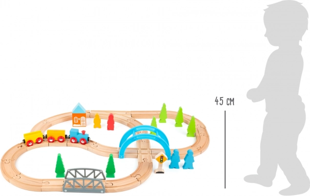 A készlet tartalmaz mozdonyt vagonokkal, hidat, házikót, fákat, figurákat és közlekedési elemeket a valósághű jelenetekhez. A természetes fa és az élénk színek kombinációja vonzó megjelenést ad és támogatja az érzékelést. Más fa rendszerekkel való kompatibilitása révén a gyerekek könnyen bővíthetik a sínvilágot.