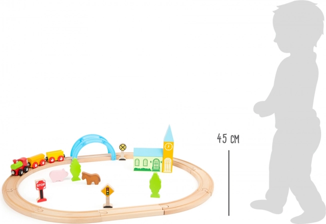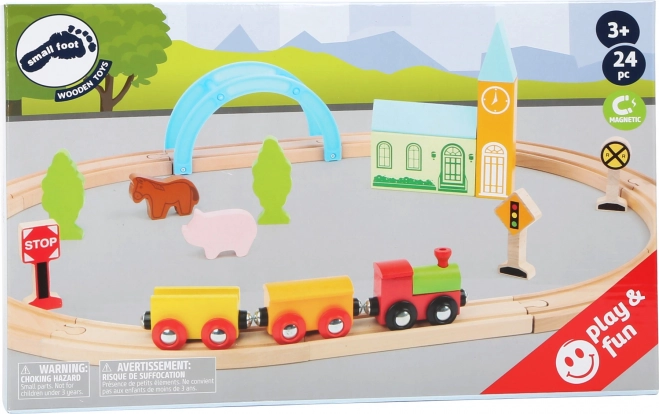 A szett 24 elemet tartalmaz, köztük mágneses kisvonatot vagonokkal, összepattintható fa síneket és színes díszítőelemeket. A tartós fa kivitel kellemes tapintású, biztonságos és ideális a kis kezek számára. A játék természetes módon fejleszti a finommotorikát, a kéz–szem koordinációt és segít a közlekedési szabályok elsajátításában.