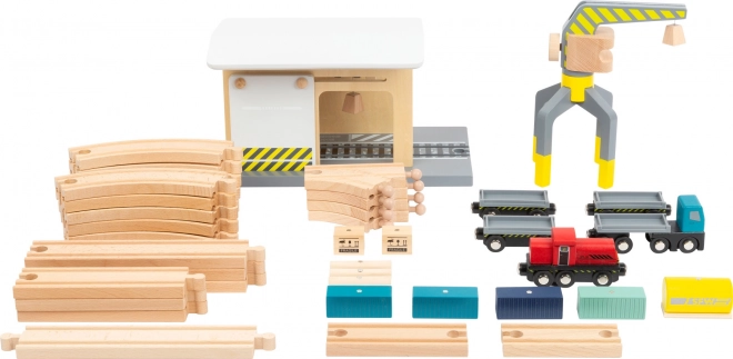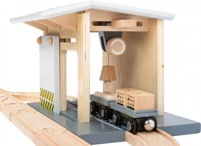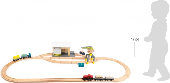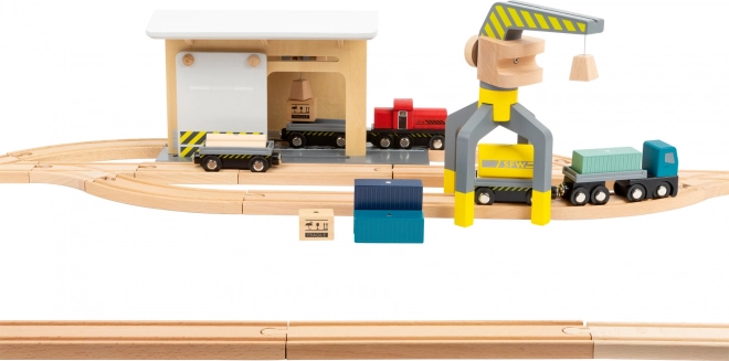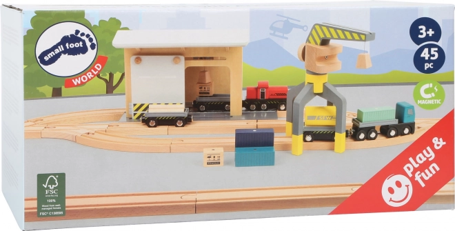 Fedezze fel a komplett fa vasúti készletet, amely teljes mértékben kompatibilis a megszokott favonat-pályarendszerekkel. A gyerekek valósághű rakodást élhetnek át a daruval, áruszállítást és játékot a depóban. A készlet akár 44 elemet tartalmaz, köztük 25 sínt, 360°-ban forgatható darut, mágneses vagonokat és rakományokat, valamint csigás tolófalat. 100% FSC fából készült a biztonságos és fenntartható játékért.