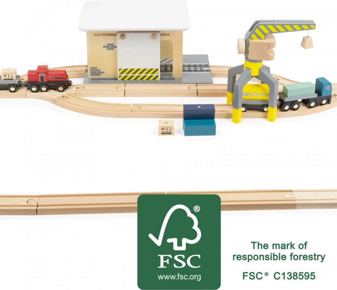 Ez a gazdagon felszerelt fa készlet hiteles teherpályaudvari élményt nyújt a gyerekeknek. A forgódaru könnyedén mozgatja a mágneses blokkokat és konténereket, a csigás tolófal rugalmas kezelést tesz lehetővé, a mágneses szerelvény pedig 25 elemből álló változatos pályán szállítja az árut. Mindez minősített FSC fából, a tartósság és a biztonságos játék érdekében.