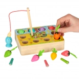 Szórakoztató, fából készült montessori játék, amellyel a gyerekek otthon élvezhetik a „horgászatot” és a kertészkedést. Mágneses horgászbot segítségével halacskákat és gilisztákat fognak, a répácskákat filc leveleknél fogva húzzák ki. Fejleszti a finommotorikát, a kéz–szem koordinációt, a türelmet és pontosságot, tanítja a színeket és a tapintási érzékelést. Minőségi fából készült, biztonságos, nem mérgező festékkel.