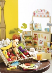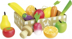A dobozban található: répa, citrom, retek, póréhagyma, padlizsán, csiperkegomba, paradicsom, banán, alma, körte, eper és egy narancs két fele. A gyerekek játékosan gyakorolhatják a színeket, a formákat és az élelmiszerek szerinti válogatást.