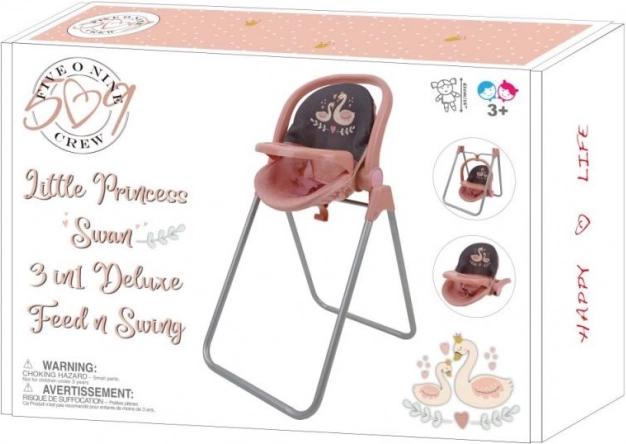 Ezzel a sokoldalú baba szettel minden nap kreatív játékká válik. Az elegáns rózsaszín-szürke kivitel hattyú motívummal remekül illik a gyerekszobába, és örömet szerez minden kis gondoskodónak. Az átgondolt kialakításnak köszönhetően az etetőszék könnyen átalakítható hintaszékké vagy hordozható tojássá.