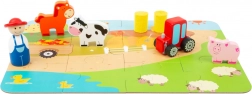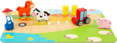 A malac röfög, a traktor dübörög. Hordozható játék gyönyörű bőröndben: a gyerekek a fa traktor, háziállatok és a farmer figuráinak köszönhetően megalkothatják saját farmjukat. Először rakjátok ki a puzzle alapját, és már kezdődhet is a játék! A farmot a szénabála figurák teszik teljessé. Merülj el a vidéki életben, és engedd szabadjára a fantáziádat. A bőrönd masszív fémből készült, a fogantyú fából van, a zár könnyen nyitható. Ideális gyerekszobába, játszószobába... Főbb jellemzők: 12 db puzzle-t és egy farmert, traktort, malacot, tehenet, lovacskát és szénabálákat tartalmaz; praktikus csomagolás – fém bőrönd fa fogantyúval