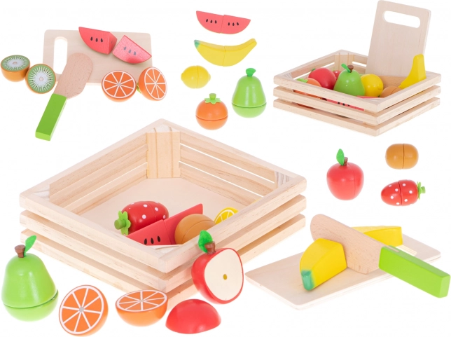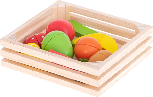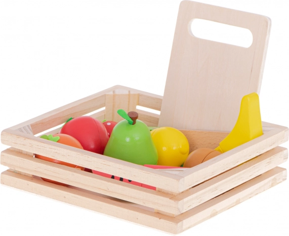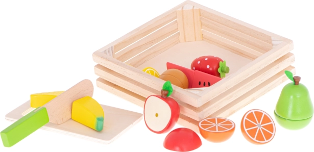 Színes fa gyümölcsök egy fából készült dobozban, hogy finom gyümölcssalátát készíthessen minden babának és plüssállatnak.