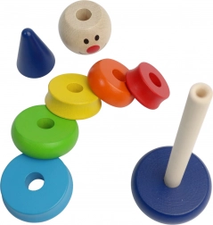 A különböző méretű karikáknak köszönhetően a gyerekek fejlesztik a finommotorikát, a logikus gondolkodást és a türelmet. A vidám színek támogatják a vizuális észlelést, valamint a színek és sorrend elsajátítását. A fa kivitel biztosítja az ellenállóságot és a biztonságos játékot.