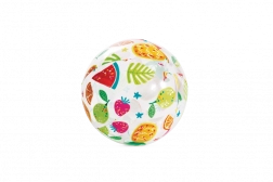 Az átlátszó labdát színes gyümölcs-, fagylalt-, halacska- és tengeri motívumok díszítik. A minta véletlenszerűen kerül kiválasztásra, de mindig vidám megjelenést és jó láthatóságot biztosít vízben és a parton is.