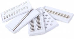 A munka közbeni biztonságról élelmiszer-tartó és pengévédő burkolatok gondoskodnak a biztonságos tároláshoz. Minden alkatrész mosogatógépben mosható 60 °C-ig, ami időt és fáradságot takarít meg. A készlet 7 cserélhető feltétet tartalmaz a maximális sokoldalúság érdekében, valamint egy kosár–csepegtetőt a gyors leöblítéshez.