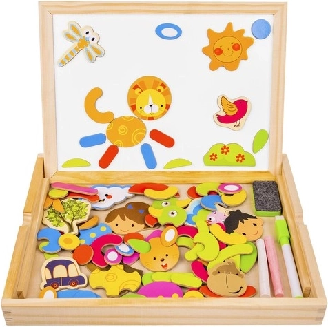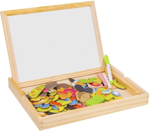 Hozzon gyermekeinek órákig tartó szórakozást és kreatív tanulást ezzel a fa mágneses táblával! A tábla két oldallal rendelkezik: fekete krétával való rajzoláshoz és fehér tollal való íráshoz vagy mágneses képek elrendezéséhez. A példákat tartalmazó füzet segítségével a gyerekek különféle mintákat és motívumokat hozhatnak létre.