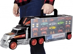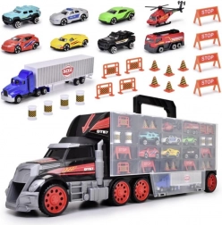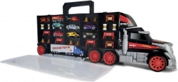 Az óriás teherautó-bőrönd egyesíti a tárolódobozt és a játékszettet. A nyitható rekeszek elfértetik a teljes jármű- és kiegészítő készletet, a praktikus fogantyú pedig megkönnyíti a hordozást. A fülkében található kézi indító mechanika versenypályává változtatja a teherautót, és akciódús rajtokról gondoskodik.