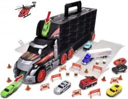 Nagy, fogantyúval ellátott teherautó-bőrönd az egyszerű hordozáshoz, amely gazdag játékszettet rejt – 7 fém kisautó, teherautó és helikopter. A kézi kilövő funkciónak a fülkéből köszönhetően a gyerekek egy pillanat alatt elindíthatják a versenyt. A masszív kivitel és a 62 cm-es hossz rengeteg szórakozást, valamint praktikus tárolást és rendszerezést biztosít a gyűjteménynek.