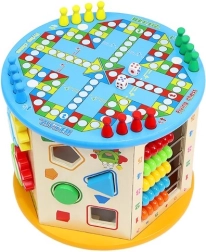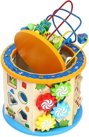 Golyólabirintus, formaszorter, fogaskerekek, abakusz, számok, óra, útvesztő és játékpanel – mind egyetlen, stabil kockában.