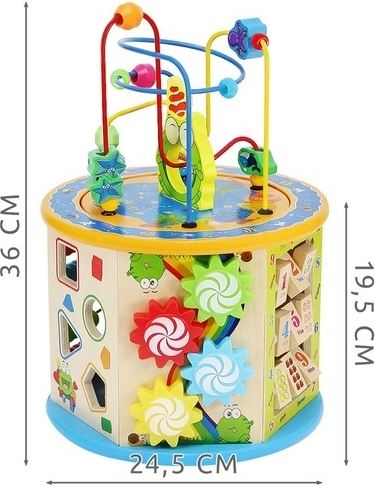 Fedezze fel a sokoldalú, 8 az 1-ben fa oktatókockát, amely hosszú órákon át tartó szórakozást nyújt, miközben fejleszti a finommotorikát, a logikus gondolkodást, valamint a színek, formák és számok felismerését. A tetején található színes golyópálya, a formaszorter, a fogaskerekek, az abakusz, az óra és a játéktábla teszik ezt a stabil játékot ideális választássá az okos játékhoz.