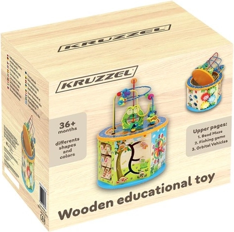 Ez a fa interaktív kocka egyesíti a tanulást és a szórakozást. A gyermek gyakorolhatja a számolást, a színek és formák megkülönböztetését, az időben való tájékozódást az órán, valamint a szem–kéz koordinációt a gyöngylabirintus és a mozgó elemek segítségével. A vidám illusztrációk és a masszív fa kivitel támogatják a kreativitást és a biztonságos játékot.