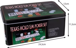 - Csomag tartalma: fém doboz, zöld szövet 92 × 58 cm, 200 zseton (5–100), 2 × pakli kártya, Dealer / Small Blind / Big Blind zsetonok, zsetontartó állvány