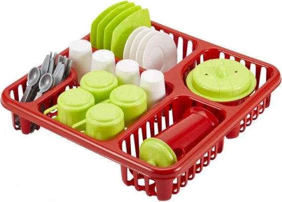 Szórakoztató és praktikus készlet a gyerekkonyhába – a nagy edényszárító edénykészlettel mindent tartalmaz, amire a kis szakácsoknak szükségük van. A gyerekek fejleszthetik finommotorikájukat, és valósághű háztartási szerepjátékot élhetnek át a csészéknek, evőeszközöknek, tányéroknak, valamint fedeles lábasoknak köszönhetően.