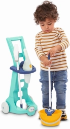A kocsi tartalmazza az összes szükséges eszközt a takarítós játékhoz, beleértve a seprűt, a felmosót és a kézi porszívót.