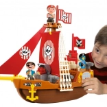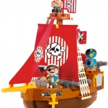 A hajó részletes elemekkel van felszerelve, mint például a koponya és keresztbe tett csontok motívummal díszített piros vitorlák, amelyek autentikus kalózélményt nyújtanak a gyerekeknek.