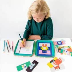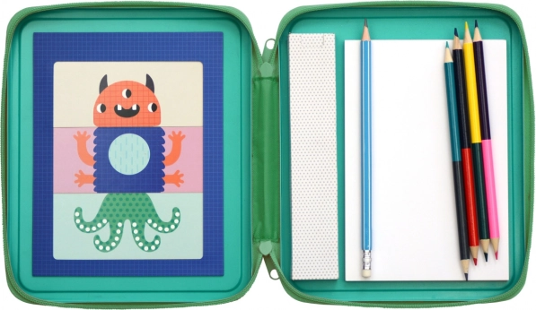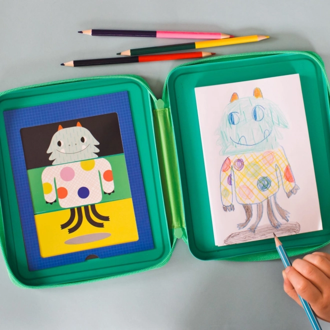 Szörnyecskék kreatív készlet a Petit Collage-tól, ideális a kis művészeknek. Tartalmaz kártyákat és pasztell krétákat az eredeti szörnyecskék megalkotásához, kompakt mágneses tokban.