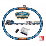 Ez a komplett vasúti készlet mindent tartalmaz az azonnali játékhoz: gőzmozdonyt, személykocsit, fedett és nyitott tehervagont, ágyazott oválsínt, valamint tápegységet vezeték nélküli analóg vezérlővel. A RONCALLI dizájnú vonat valósághű megjelenésével és megbízható futásával nyűgöz le.