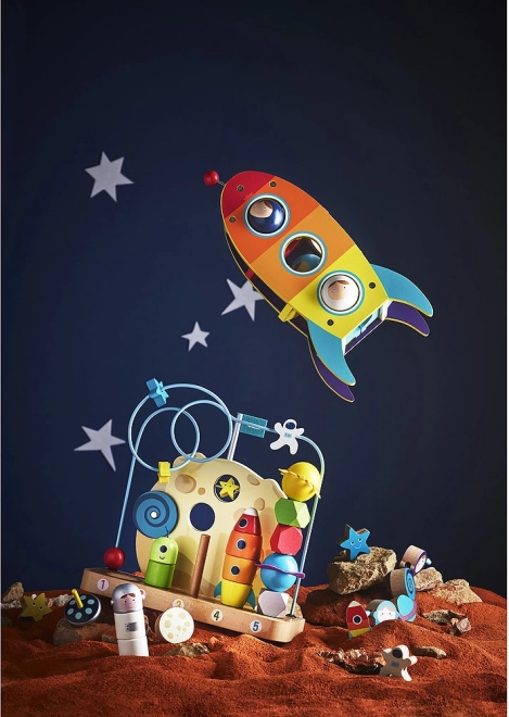 Gyönyörű űrbéli fűzős játék, kiváló a finommotoros készségek fejlesztésére gyermekeknél. 14 gyönyörűen illusztrált fa gyöngyöt tartalmaz, mint például űrhajós, hold, nap és rakéta.