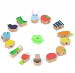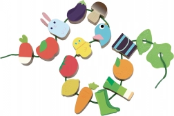 A játék minőségi fából készült, egészségre ártalmatlan festéssel. A textil zsinór biztonsági végződései könnyű és biztonságos felfűzést biztosítanak, így a gyerekek önállóan vagy szülőkkel együtt is játszhatnak. A fűzős játék fejleszti a finommotorikát, a logikus gondolkodást és a vizuális észlelést.