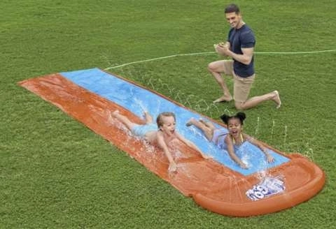 Ez a hosszú kerti vízi csúszda két párhuzamos pályát kínál versengő futamokhoz gyerekeknek és felnőtteknek egyaránt. Az oldalsó vízsugarak kaszkádja folyamatosan nedvesen tartja a felületet, így a csúszás gyors, egyenletes és üdítő még a legmelegebb napokon is.