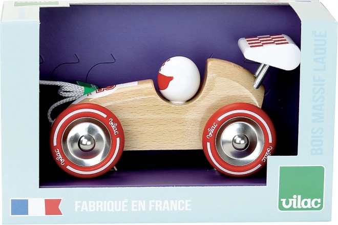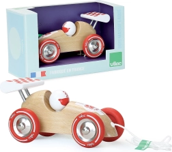 Ez az elegáns fa versenyautó feltűnő piros részleteivel és szárnyával első pillantásra elnyeri a gyerekek tetszését. A zsinór segítségével könnyen magukkal vihetik a lakásban és a szabadban is, húzás közben pedig természetesen fejlődik a stabilitásuk és a koordinációjuk. A gumírozott fém kerekek sima és halk gurulást biztosítanak.