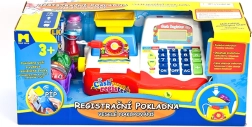 Kedvelt persely-pénztár kihúzható pénzfiókkal, működő gombokkal, mikrofonnal, mérleggel, kosárral és számos élelmiszer-makettel a kis kereskedőknek. Elemmel működő termék. 3 éves kortól ajánlott.