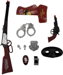 Változtasd a gyerekszobát vadnyugati prérivé! Ez a játék-készlet mindent tartalmaz a kalandos jelenetekhez – a „seriff” bilincstől a „coltig”, amely teljessé teszi a jelmezt és beindítja a fantáziát. A könnyű, könnyen kezelhető kiegészítők gyerekkezekhez lettek tervezve.