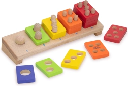 A tömör fából készült, masszív kivitel és a sima felületkezelés biztonságos játékot garantál. Az élénk színeknek köszönhetően a játék ismételt használatra ösztönöz, és hatékonyan fejleszti a finommotorikát, a koncentrációt és a türelmet.
