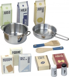 Játék konyha, séfsapka és kötény, sószóró, borsőrlő, fakanál, fazék, serpenyő, tetrapak csomagolású „élelmiszerek”
