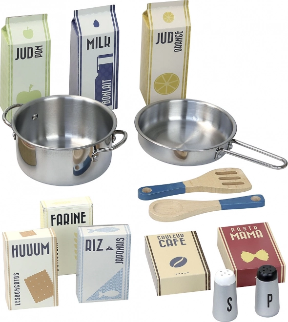 - Játék konyha, séfsapka és kötény, sószóró, borsőrlő, fakanál, fazék, serpenyő, tetrapak csomagolású „élelmiszerek”
