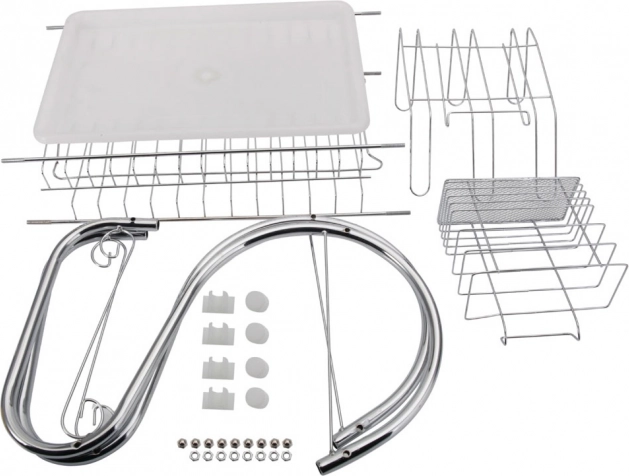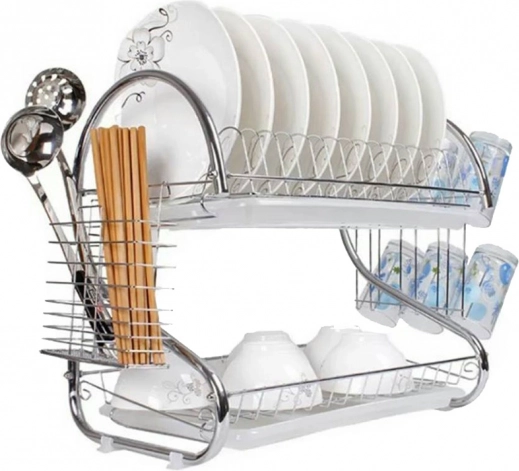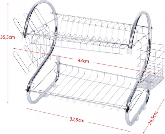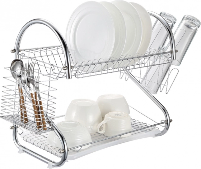 A kétszintes edényszárító minden konyha nélkülözhetetlen kelléke. Praktikus kialakításának köszönhetően nagy mennyiségű tányért, tálat és poharat helyezhetünk el rajta. A termék két akasztóval rendelkezik, az egyik evőeszközökhöz, a másik poharakhoz vagy borospoharakhoz.
