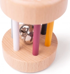 A gyerekek nemcsak rázni és zörgetni tudják ezt a csörgőt, hanem gördíteni is a felületen. A 6 különböző színű oszlopnak és a középen található fényes kis csengőnek köszönhetően a csörgő fejleszti a kéz-szem koordinációt. Tartós és könnyű, ami kényelmes fogást biztosít.