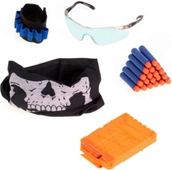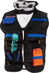 taktikai mellény, 20 db habszivacs lövedék, 6 lövedékes műanyag tár, lövedéktartó csuklópánt, védőszemüveg (kék), mintás bandana/sál, csomagolás: fóliatasak