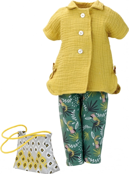 A trópusi növény- és madármintás zöld nadrág friss, játékos megjelenést kölcsönöz a babának. A minta szépen harmonizál az okkersárga blúzzal.