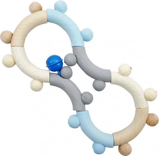 Magas minőségű fa csörgő, ideális a képzelőerő serkentésére és a gyermek finom motorikus készségeinek fejlesztésére. A csörgő szemet gyönyörködtet pasztell színeivel, és etikus módon, környezetbarát erdőkből származik.