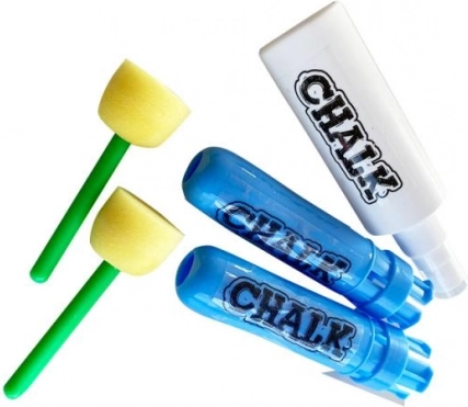 A készlet tartalmaz 10 krétát, 2 tartót, betűsablonokat, 2 szivacsot és egy vízpermetezőt. Minden, amire szükség van a szórakoztató és kreatív festéshez.