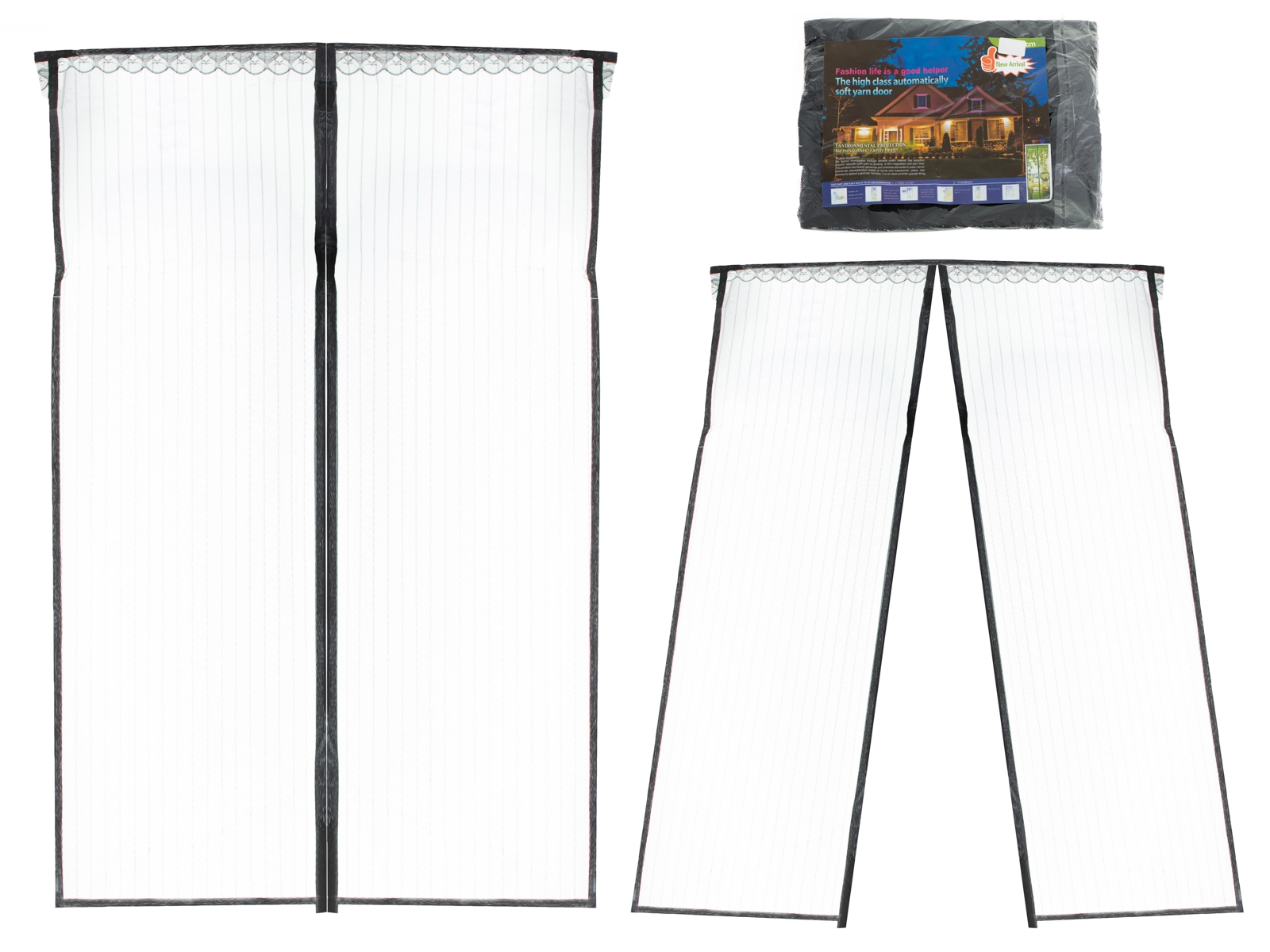 A felszerelés gyors és egyszerű – a mellékelt gombostűkkel könnyedén rögzíthető az ajtófélfába. Szezon után könnyen levehető és kézzel mosható. Az univerzális fekete kivitel a legtöbb enteriőrhöz illik.