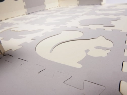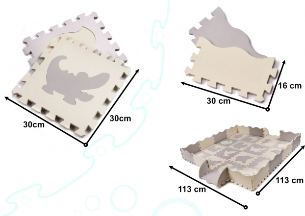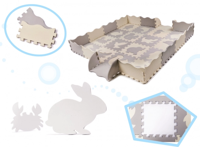 Nagy méretű hab elemek kivehető állatformákkal, amelyek támogatják a forma-felismerést, a kreativitást és a finommotorikát. Az elemekből könnyedén összeállítható egy sík szőnyeg vagy megemelet peremű elkerített rész, amely biztonságos játszózónát jelöl ki. A texturált felület kellemes tapintású és nem csúszik.