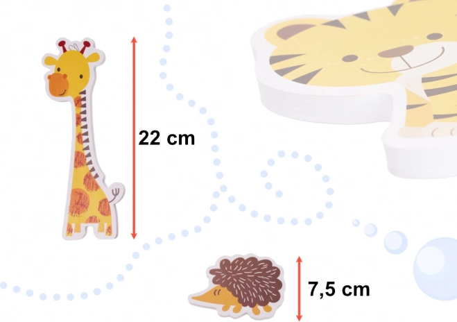 Vidám motívumok, mint zsiráf, tigris, majmocska vagy sün, amelyek élénk színeikkel felkeltik a gyerekek érdeklődését, és támogatják a kreatív kirakást és mesélést.