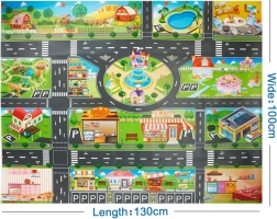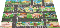 A szőnyeg bemutatja a városi tájat utak, épületek és parkok ábrázolásával, így ösztönözve a gyermekek képzelőerejét és kreativitását a játékok során.