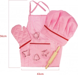 A készlet mindent tartalmaz az első főzéshez és sütéshez: 56 × 43 cm-es kötényt, szakácssapkát, edényfogót, fa nyújtófát és süteménykiszúrókat. Ideális játékkonyhába és közös, felügyelettel végzett sütéshez is.