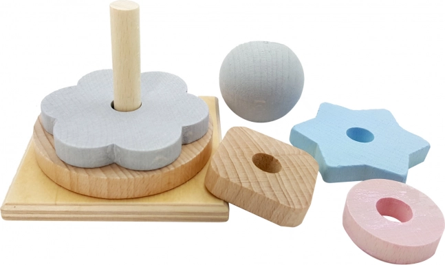 Klasszikus játék öt rakodható formával és egy fa labdával, amely ideális a kisgyermekek számára. Alakja miatt könnyen megfogható és segít fejleszteni a koordinációt és a kéz finommotorikáját.