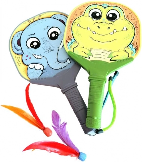 Állatos mintájú ütők labdákkal és tollakkal.